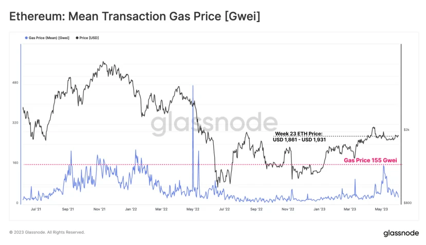 自今年 3 月份以来,ETH 价格一直在相对稳定的范围内震荡,在这个阶段,平均 gas 费为 76 GWE。但 gas 价格在 5 月份经历了较为明显的上涨, 5 月初的平均 gas 费达到 155 GWEI,几乎达到了 2021 – 2022 年牛市周期的水平。