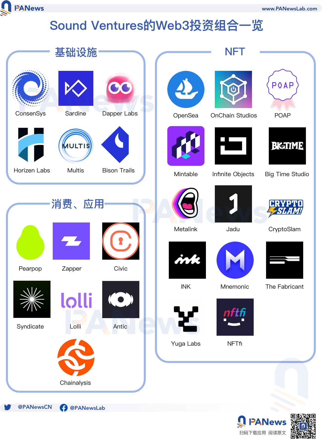 由于 Sound Ventures 官网只展示极小部分已退出的投资项目,PANews 根据公开信息统计到,Sound Ventures 目前投资了 27 个加密项目,其中在 NFT 领域的投资占据了半壁江山。根据披露的信息,Sound Ventures 多次与 z 16 z、Seven Seven Six 及马克库班一起出现在投资者名单中。