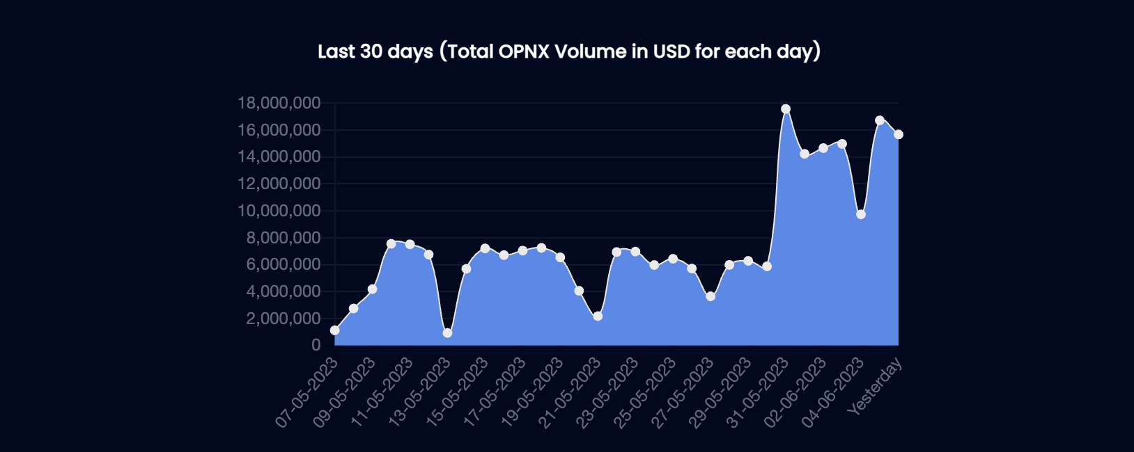 在支持代币化的债权交易的同时,OPNX 同样开启了 BTC、ETH 等主流加密货币的现货与期货交易。与债权代币几乎无人交易的情况不同,OPNX 的永续合约交易交易量呈上升趋势。根据官网数据,近期 OPNX 每天的总交易量约为 1500 万美元。
