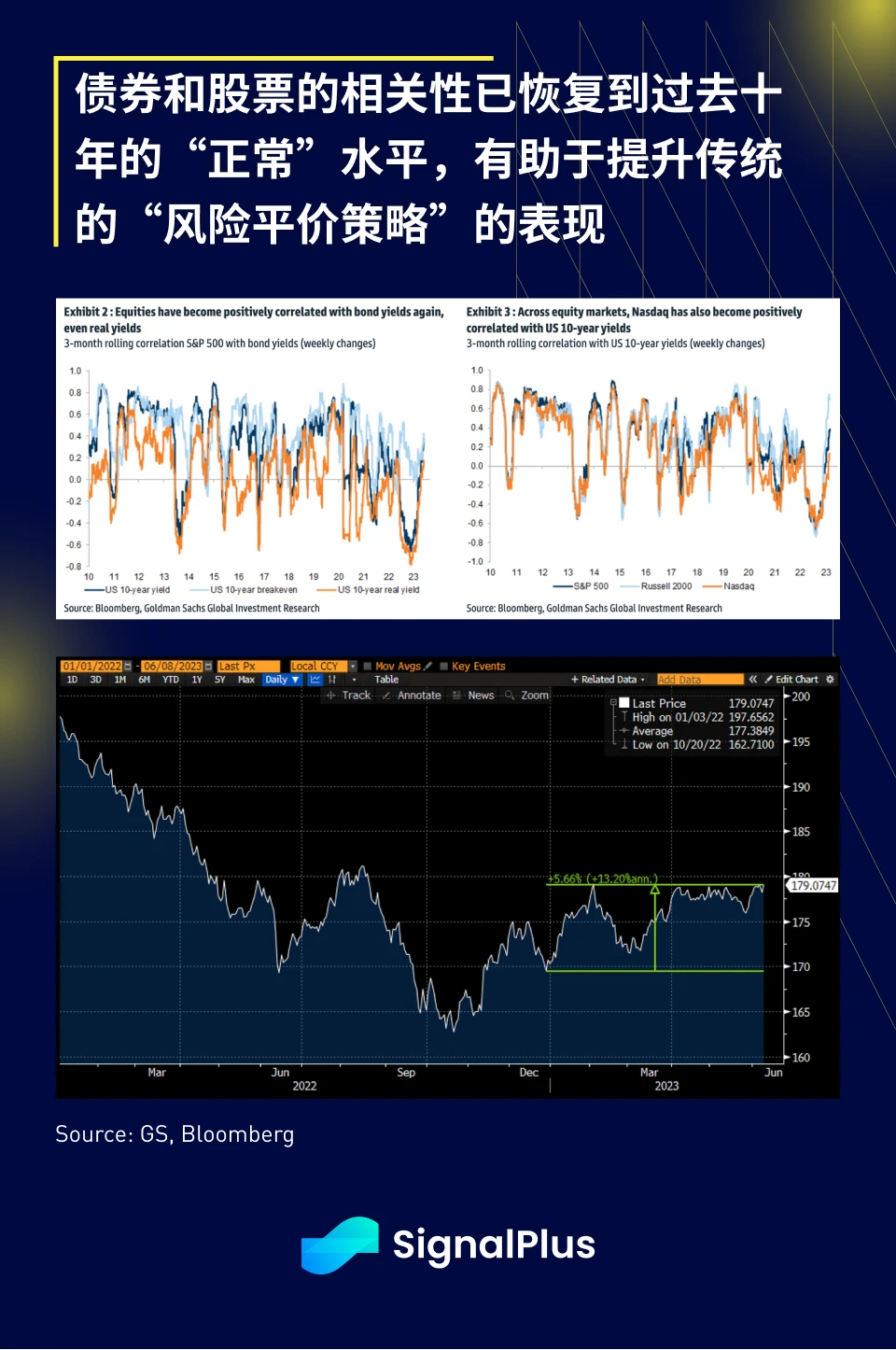 随著投资者和企业管理层的风险情绪持续改善,隐含的经济衰退概率也开始下降,但经济动能仅刚好“足够慢”到得以维持当前的理想荣景。 不同资产的关联性已基本恢复正常 ,SPX 和 Nasdaq 价格再次与债券收益率呈现近乎完美的关联性,有助于提升典型风险平价策略的表现(年初至今 + 6% )并提振投资情绪。