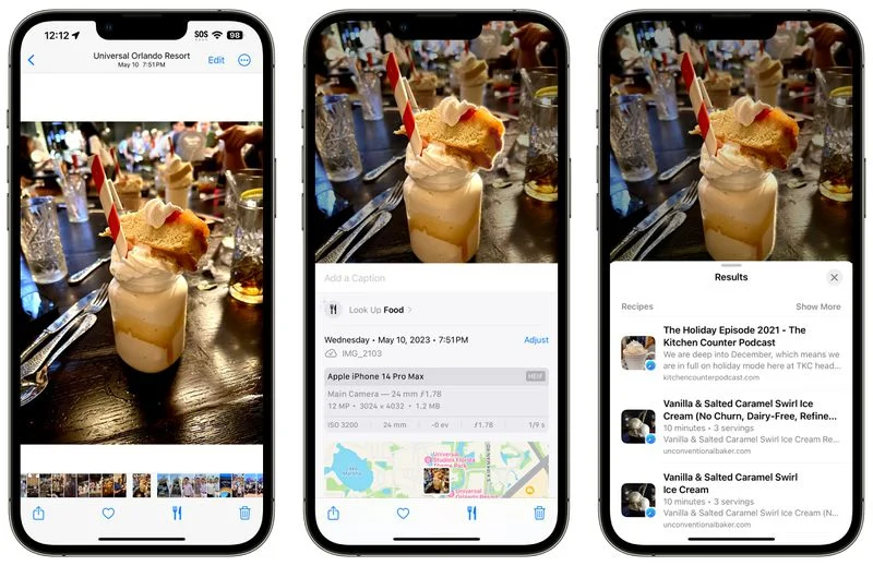 可视化查找功能。可根据食物照片查找食谱,自从iOS 15引入了可视化查找功能以来,用户就可以通过它了解自己拍摄的物品。现在,还可以找到与用户相册中照片相似的菜肴的食谱。也可以获取有关视频或从Apple照片库中提取的剪辑的信息。