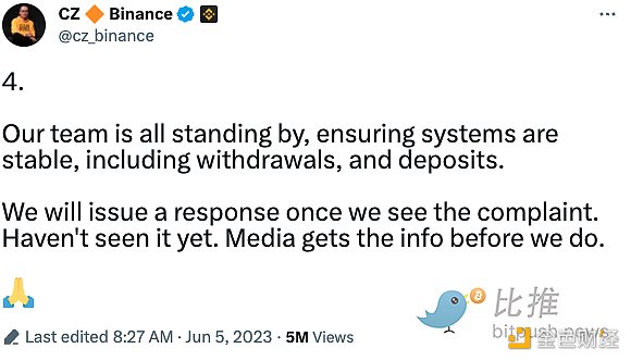 币安说:“虽然我们认真对待 SEC 的指控,但它们不应成为 SEC 执法行动的对象,更不用说在紧急情况下了。 我们打算大力捍卫平台”。