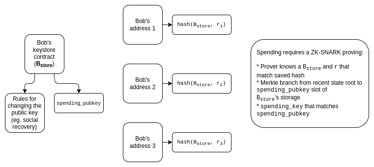 每个用户都有一个密钥库合约,它存在于一个位置(可以是主网或特定的 L2)。 然后,用户在不同的 L2 上拥有地址,其中每个地址的验证逻辑是指向密钥库合约的指针。 来自这些地址的支出需要进入密钥库合约的证明,以显示当前(或者更现实地说,最近)的支出公钥。