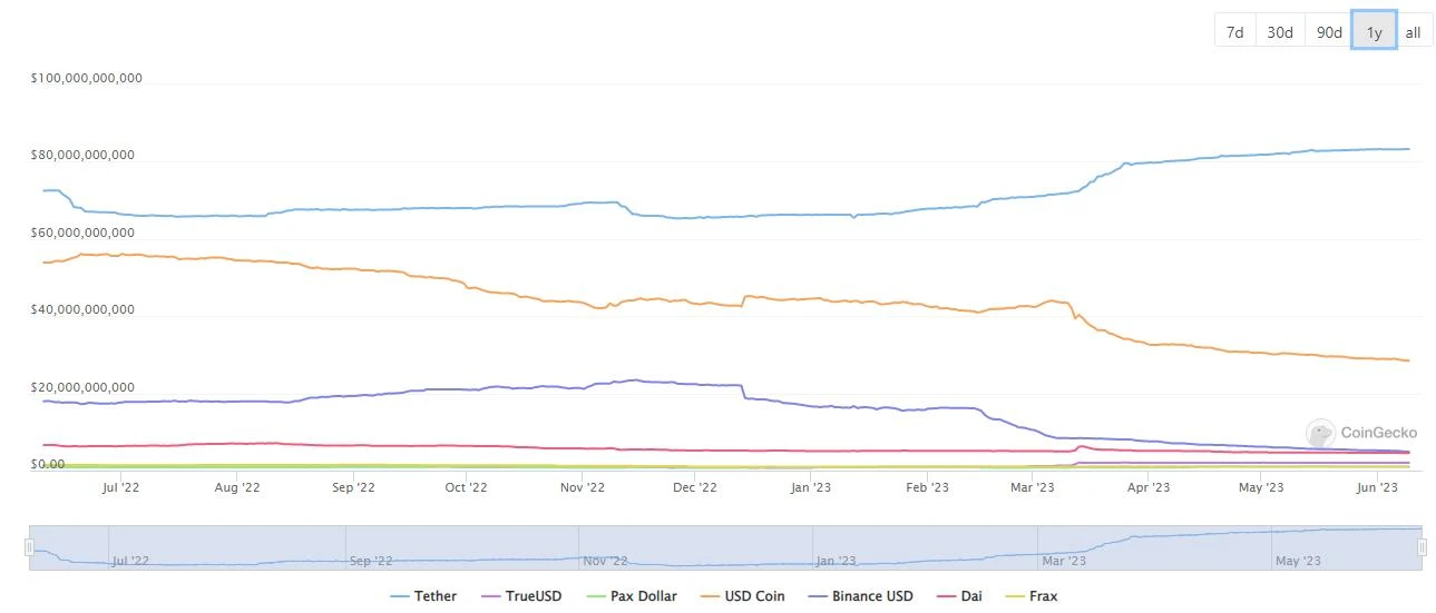 据 Coingecko 数据,稳定币 USDT 目前发行量已超 833 亿美元,市场占有率已超过 60% ,且还在不断增长。作为世界上最大的稳定币发行商,Tether 一直是监管机构的重点关注对象,其财务状况和透明度也多次受到市场的质疑,尽管如此,在 Terra 的 UST 崩盘事件、多家加密银行倒闭等黑天鹅事件后,Circle 的 USDC 也曾一度脱锚后,Tether 仍表现仍然稳定,并在多次危机后保持了强劲的发展态势。今年 5 月,Tether 宣布完成由独立会计师事务所 BDO Italia 进行的审计,第一季度净利润达 14.8 亿美元,环比增长超一倍。