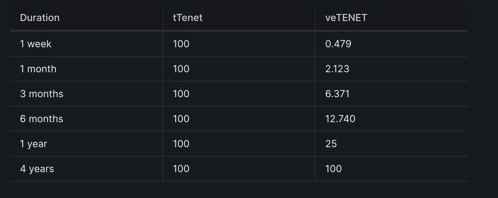 除此之外,用户在质押 TENET 时,将收到一个名为 tTENET 的 TENET LSD。TENET 的代币模型来自 veTokenomics,用户可以锁定 tTENET 以产生 veTENET。veTENET 代表投票托管的 TENET,意味着 tTENET 被锁定的时间越长,收到的 veTENET 就越多,与传统的 veToken 模型一样,veTENET 可以对协议治理和奖励标准进行投票,锁定 tTENET 为 veTENET 时间最短为一周最长为一年。以下是锁定 token 获取 veTENET 的标准: