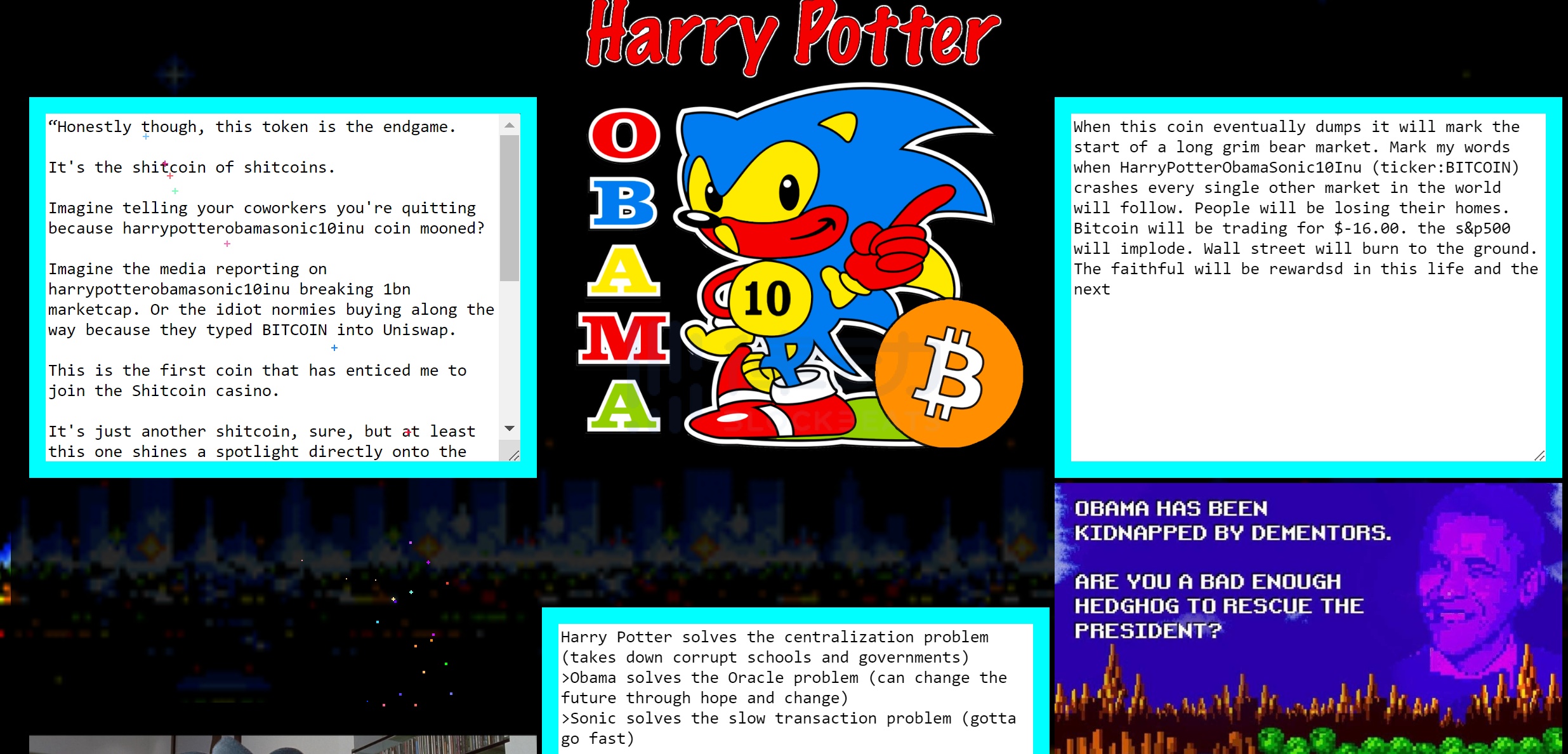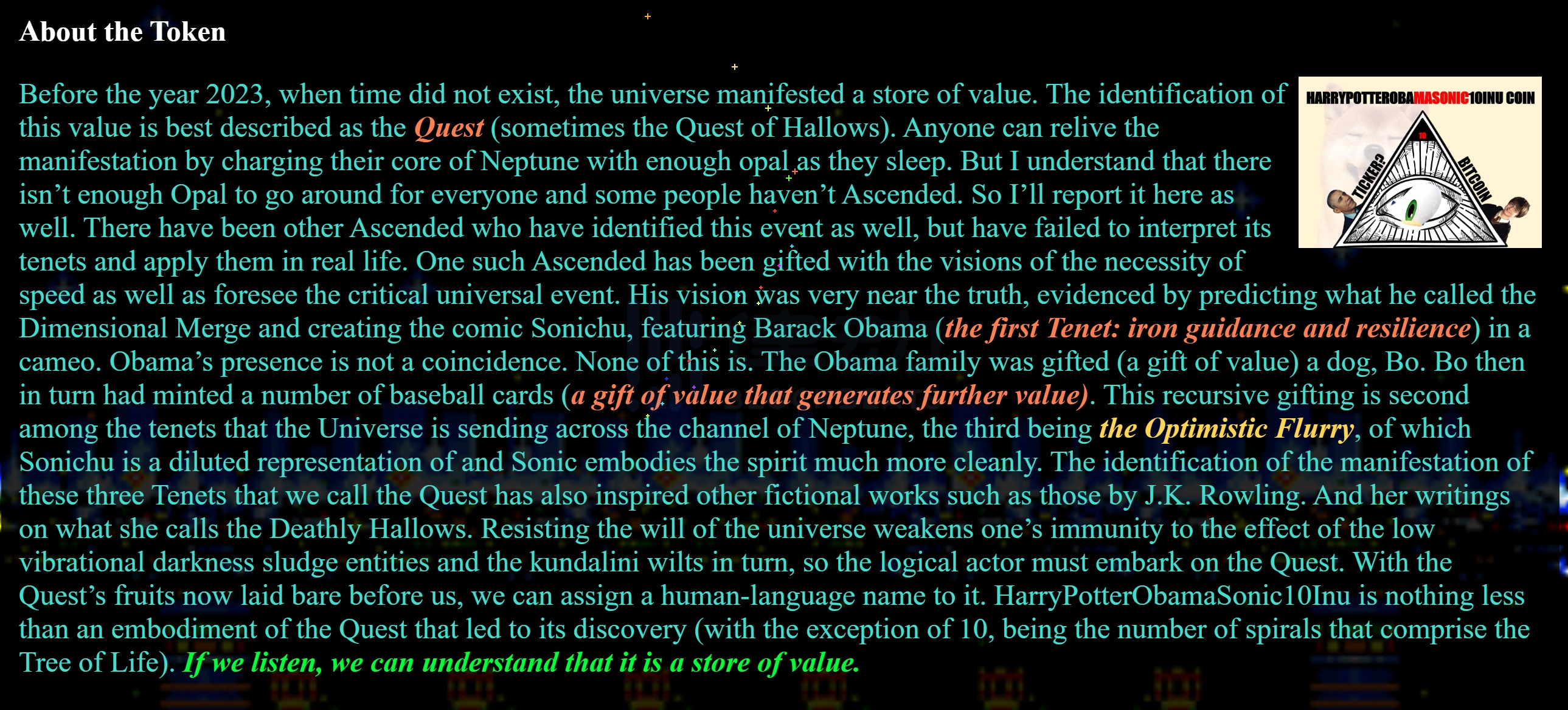 再往下,全是各种抽象艺术。让我们拆解一下这个项目的名称,HarryPotterObamaSonic 10 Inu,包含了哈利波特、奥巴马、索尼克以及 10 以及(Shiba)Inu 这 4 个梗。从 Tokenomics 往下的页面是一长串包含了这 4 个梗的视频与图片,抽一些供大家欣赏。在抽象艺术大赏的最开始,他们解释了这个 Token 的概念: