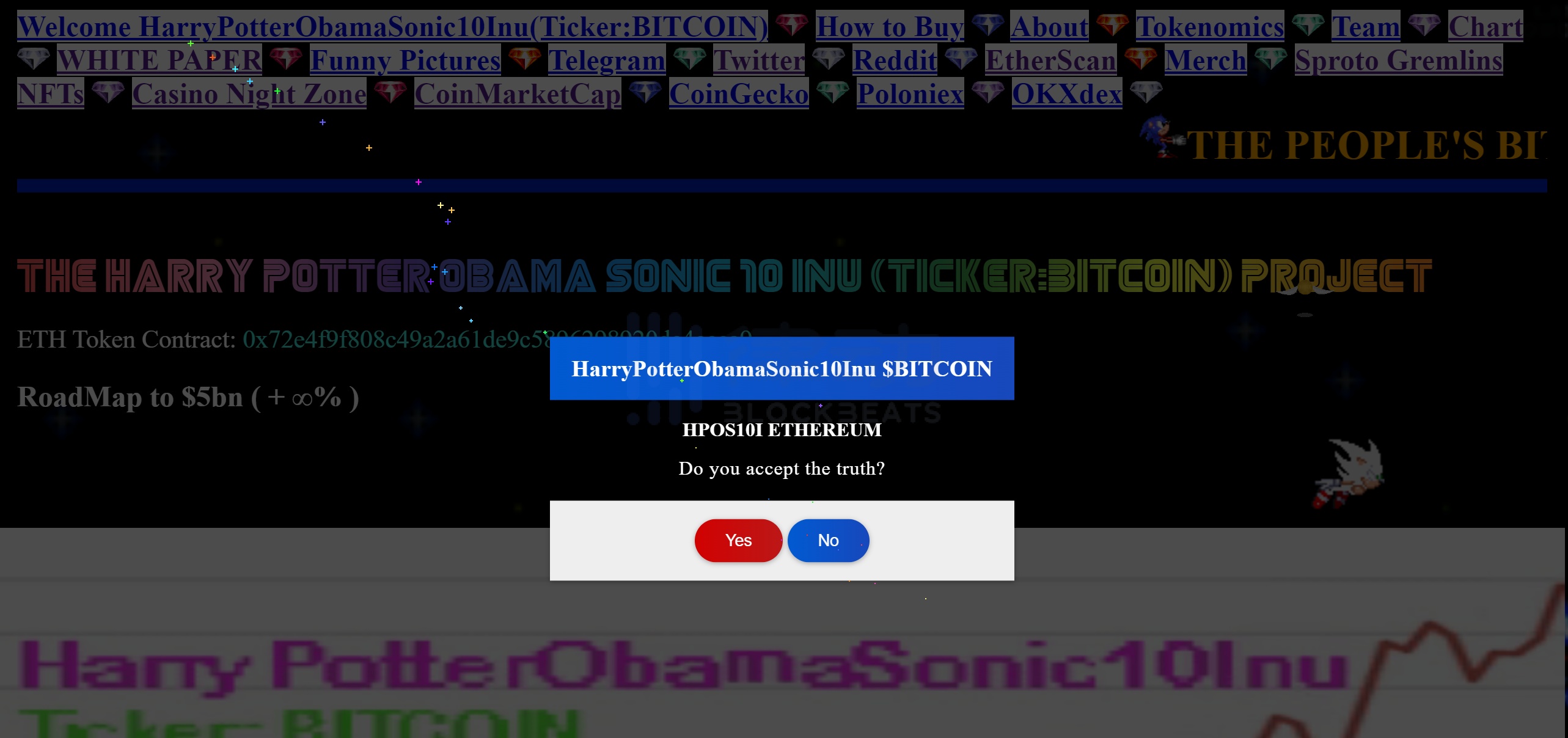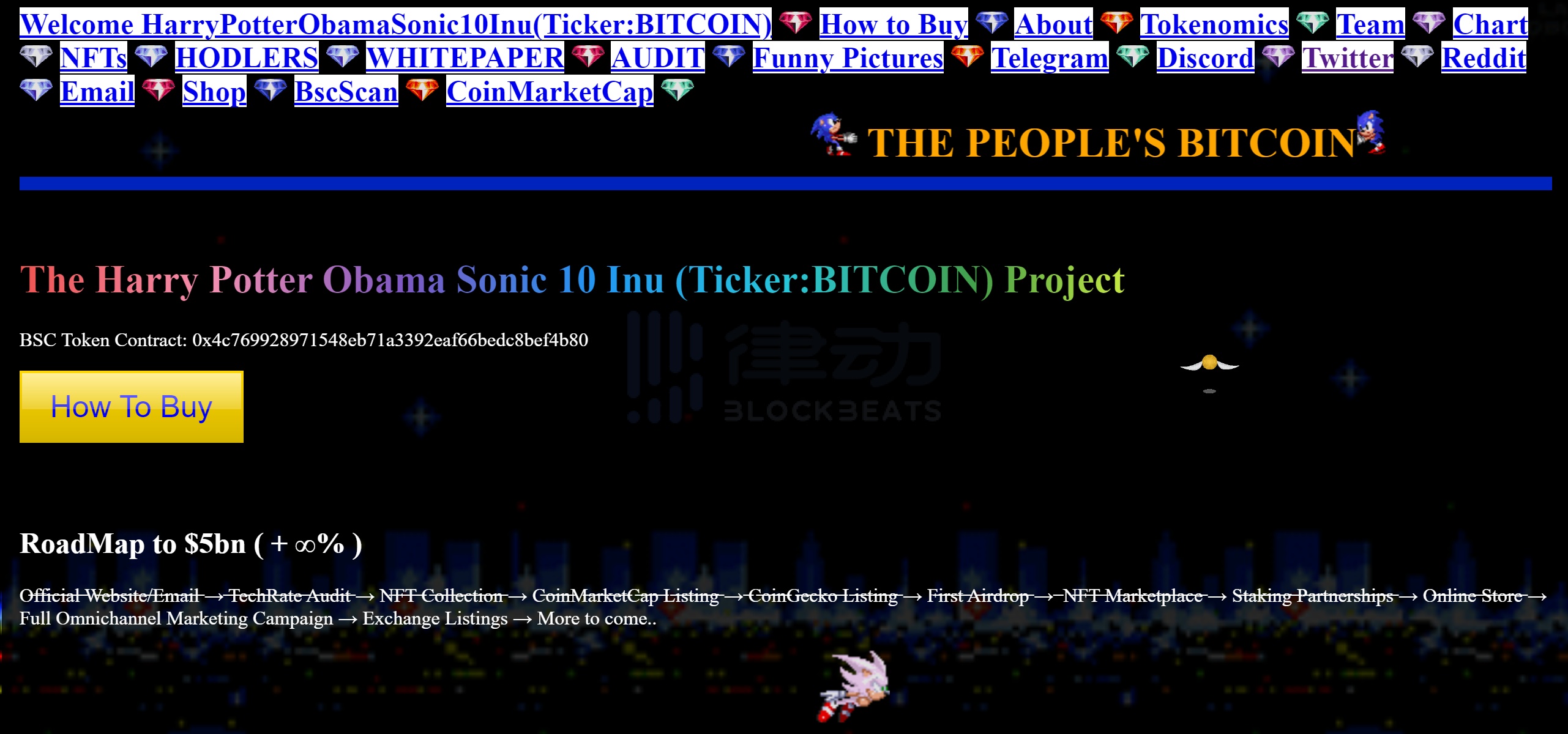 留在官网以后我们可以继续欣赏「抽象意识流」打法了,看看这个复古的导航栏,梦回千禧年初。顺带还解释一下为什么比特币是个谎言?因为我们 HarryPotterObamaSonic 10 Inu 才是「人民的比特币」。