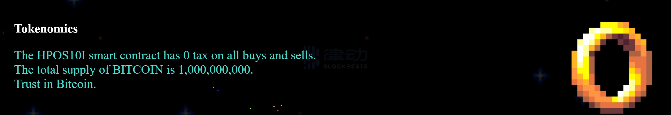 再接着,Tokenomics 介绍,$BITCOIN 总量 10 亿个,买入卖出都不收税。旁边索尼克游戏中的金环不断 360 ° 旋转,我不禁冒出一句,哥们,你家索尼克吃的金环真多...