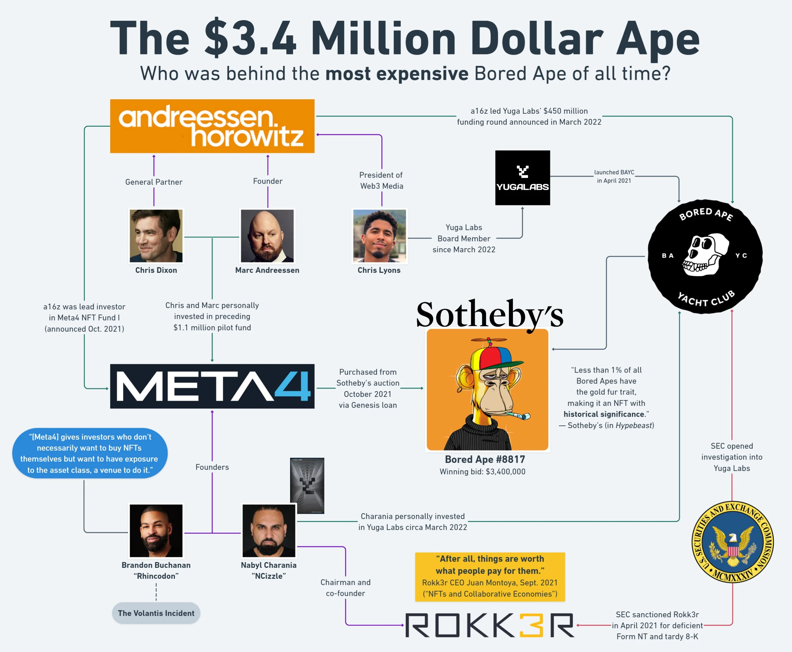 waveninja 1 发现,本次拍卖似乎并没有表面看上去那么简单。本次拍卖的最终购买人,实际与 BAYC 母公司 Yuga 存在着千丝万缕的联系。 a16z、Marc Andreesen 和 Chris Dixon 都参与其中。
