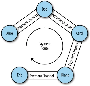 闪电网络的支付通道和路由,图片来源: https://cypherpunks-core.github.io/bitcoinbook/ch 12.html