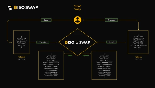 文档中交换代币功能的描述为用户发送 BRC-20 的 TokenA transfer 铭文给 BisoSwap,BisoSwap 读取部署的 LP Token“合约”,计算并更新池子中 TokenA 和 TokenB 的最新数值,并将 TokenB 的 transfer 铭文发送给用户,用户可以根据自身需求在目标链上赎回锁定的资产。