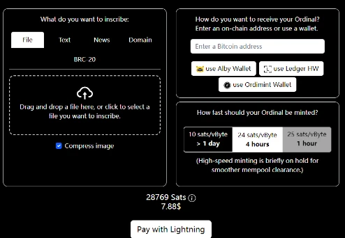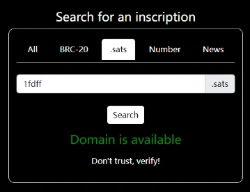 Ordmint 目前主要是一个铸造工具,它支持通过闪电网络支付 btc 来铸造铭文。它还有一些查找功能,但做的并不是很完善。它目前可以帮用户查看.sat 域名是否已被铸造,虽然它在前端还添加了其他的查找选项,但截止目前还不能使用。