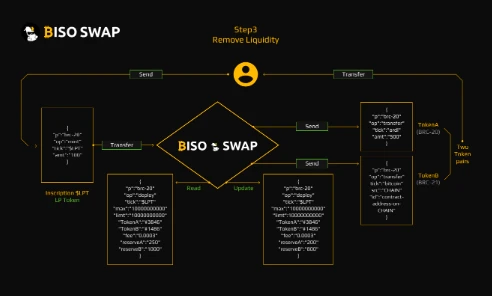 移除流动性则是用户将 LP Token 的 mint 铭文 transfer 给 BisoSwap,BisoSwap 读取部署的 LP Token“合约”,计算并更新池子中 TokenA 和 TokenB 的最新数值,并将 TokenA 和 TokenB 的 transfer 铭文发送给用户。