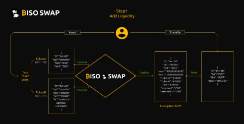 根据增加流动性的工作流描述,用户需要发送 BRC-20 和 BRC-21 交易对到 BisoSwap,由 BisoSwap 在链上 Deploy LP Token 的铭文,并 mint 后 transfer 给用户。