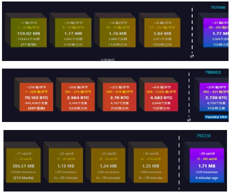上面三图时间分别是 2023 年 4 月 30 号, 5 月 8 号, 5 月 31 号 mempool 交易费用图
