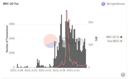 BRC-20 代币的交易量保持高位,BRC-20 市场持续活跃。 目前,BRC-20 交易的总数超过 843 万,手续费总额超过 1280 个 BTC。(截止到 2023 年 5 月 31 日 17 : 27 的数据)