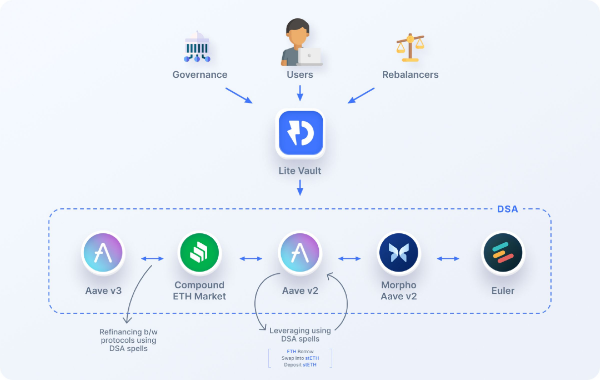Instadapp 是一个推动 DeFi 间互操作性的项目,Instadapp Lite v1有仅面向 Aave v2的 ETH,但在上海升级后这一策略跟不上 LSDFi 的发展。为此,Instadapp 推出了 Lite v2,这是一个专为多种与 stETH 相关策略设计的,仅限 ETH 存款的 Vault。Lite v2将使用 Aave v2、Aave v3、Morpho、Compound、Euler 等借贷市场抵押 wstETH 借入 ETH,兑换为 wstETH,再循环操作来获得收益增强的 LSD 收益。Instadapp 抽取 20% 的收益,而存款人也能获得比 Lido stETH 稍高的收益。