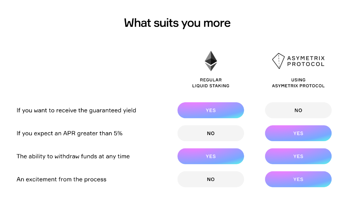 Asymetrix 提供非对称的质押收益,用户将 stETH 存入协议,协议获得质押收益,但不会将收益公平的分配给每一个人,而是通过 Chainlink VRF 随机抽取一名幸运者分配所有收益。所有人总是保留自己的本金,也可以随时提款。