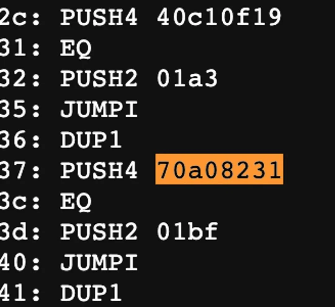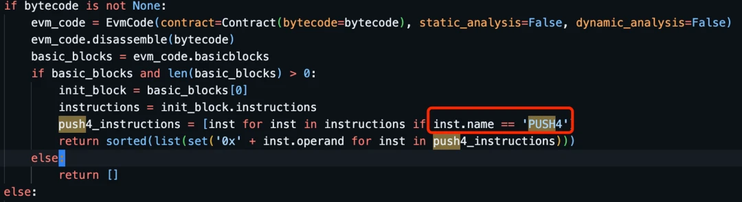 我们就可以清晰的发现一个特征,函数签名都会被 PUSH 4 这个操作码所执行,所以进一步的方法则是从全文中提取 PUSH 4 后的内容,与函数标准做匹配。