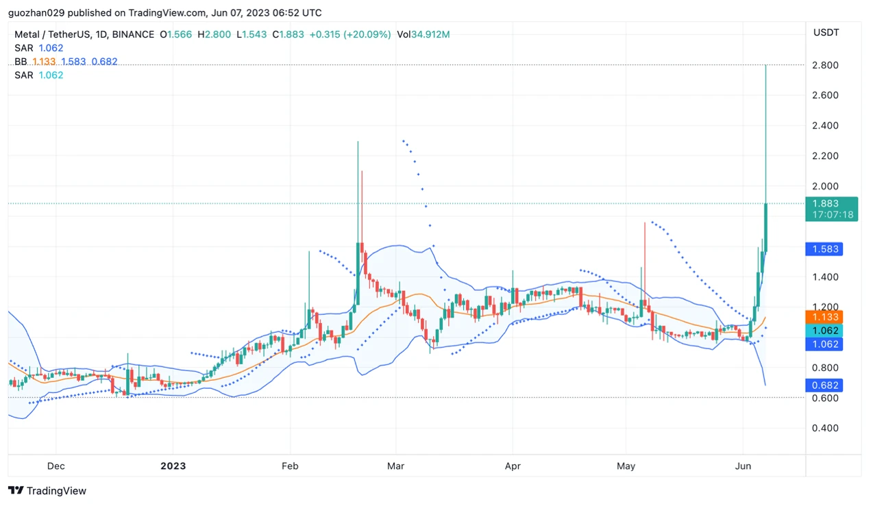 3、MTL: Metal 是带有用户激励的加密资产支付平台,是 2017 年的老项目。市场主力控盘约 10% 的流通盘,近期在韩国交易所 Upbit 上交易量很夸张。
