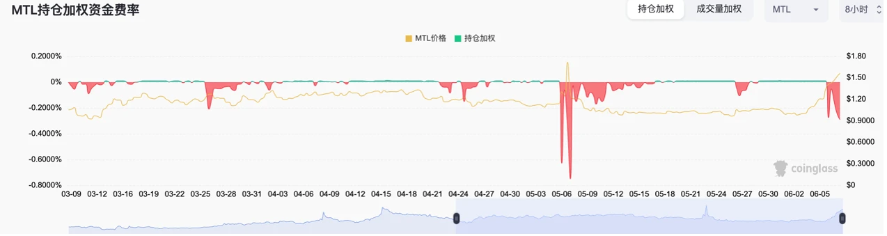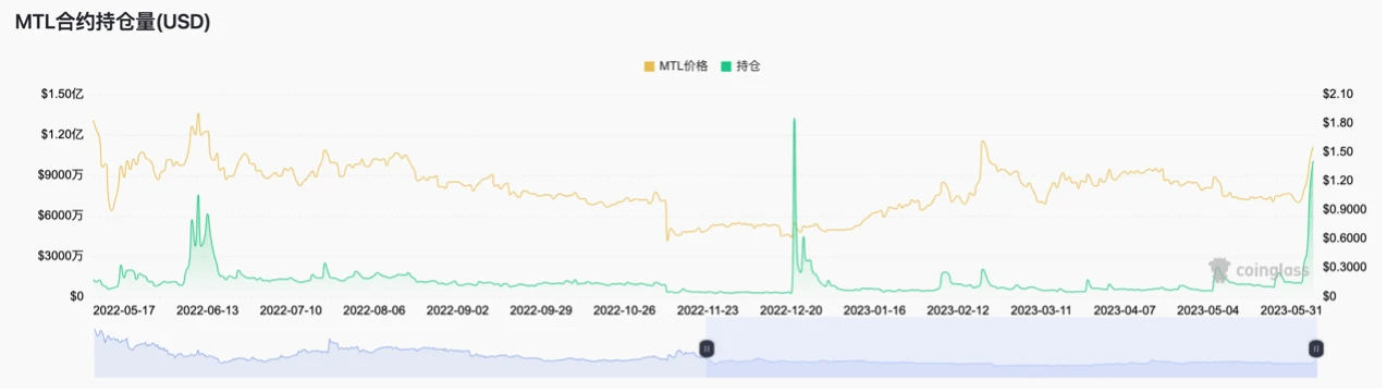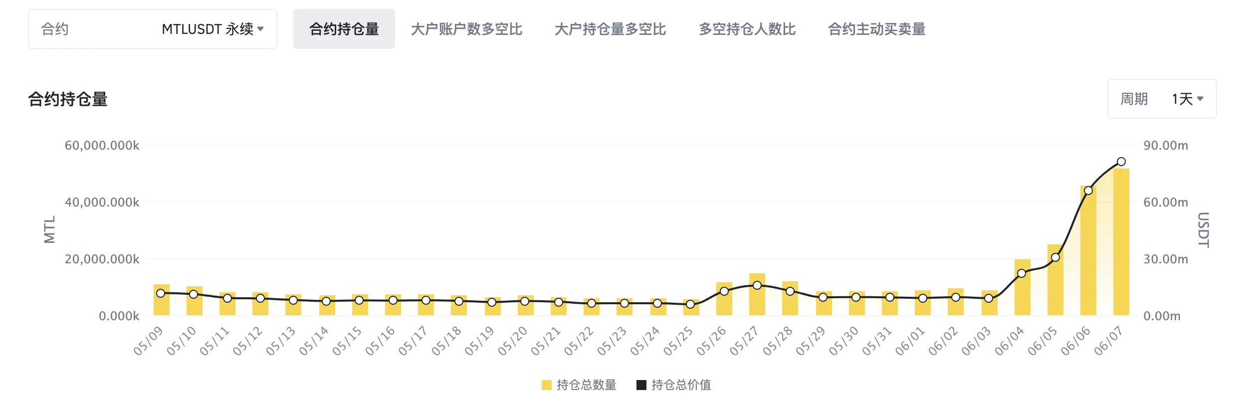 我们可以观察到,MTL 的合约资金费率在 5 月 6 日出现异常,但轧空过快一天结束。然后 6 月 6 日再次出现异常,后期一度高达-1.8% 的极值。更重要的是, 6 月 6 日起合约持仓量大幅攀升,持仓量 6000 万美元,很接近流通市值 8000 万美元。合约成交量 8000 万美元,接近现货成交量 1.6 亿美元的 50% 。这波轧空行情 MTL 在一周时间内上涨了 2-3 倍。