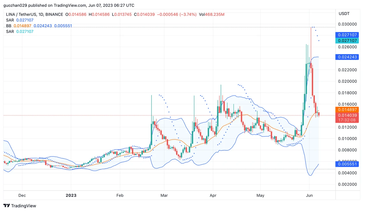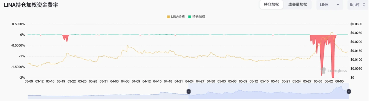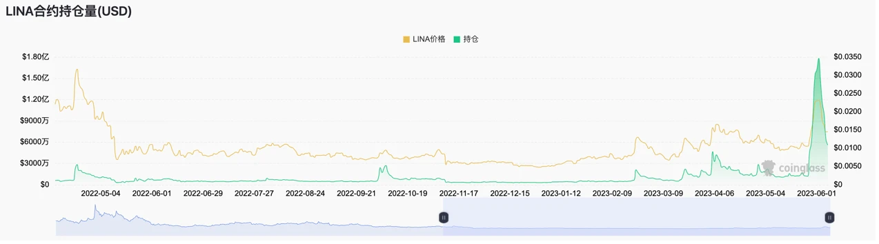 我们可以观察到,LINA 的合约资金费率从 5 月 28 日起,大幅超过-0.1% ,最高在 5 月 31 日和 6 月 3 日达到-2% 的顶格资金费率。合约持仓也从 5 月 28 日开始大幅上涨,持仓量 5000 万美元,而此时流通市值仅 7000 万美元;合约成交量 5000 万美元,接近现货成交量 9000 万美元的 50% ,很容易引发空头平仓供不应求的情况。于是 5 月 28 日到 6 月 3 日一周时间,LINA 币价快速拉升上涨 2-3 倍。