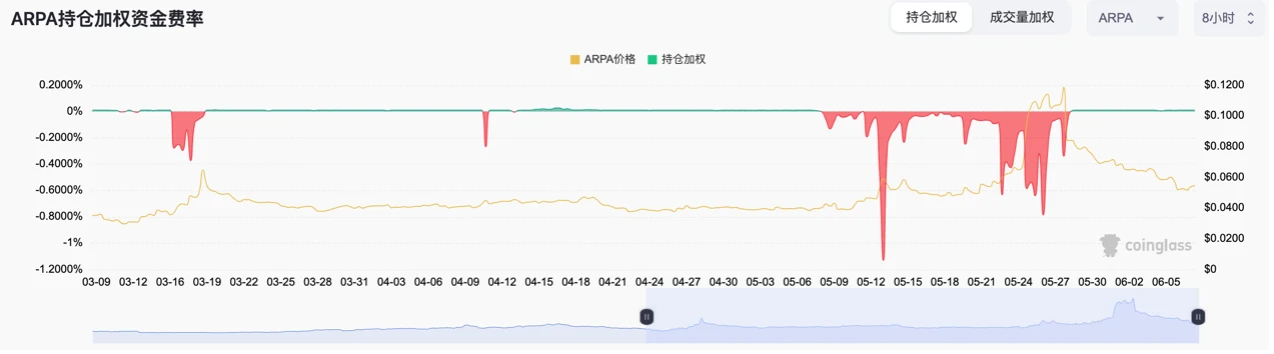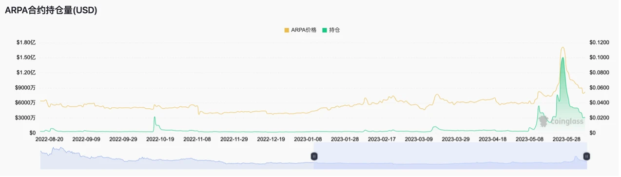 我们可以观察到,ARPA 的合约资金费率从 5 月 12 日起,大幅超过-0.1% ,中间虽经历波折,但高费率一直持续到 5 月 16 日,极值一度高达-1% 。更重要的是合约持仓,从 5 月 12 日开始大涨,持仓量 3000 万美元,接近流通市值 4000 万美元。合约成交量 3000 万美元,接近现货成交量 7000 万美元的 50% 。于是 ARPA 的轧空行情在两周时间内,快速上涨 3-4 倍。