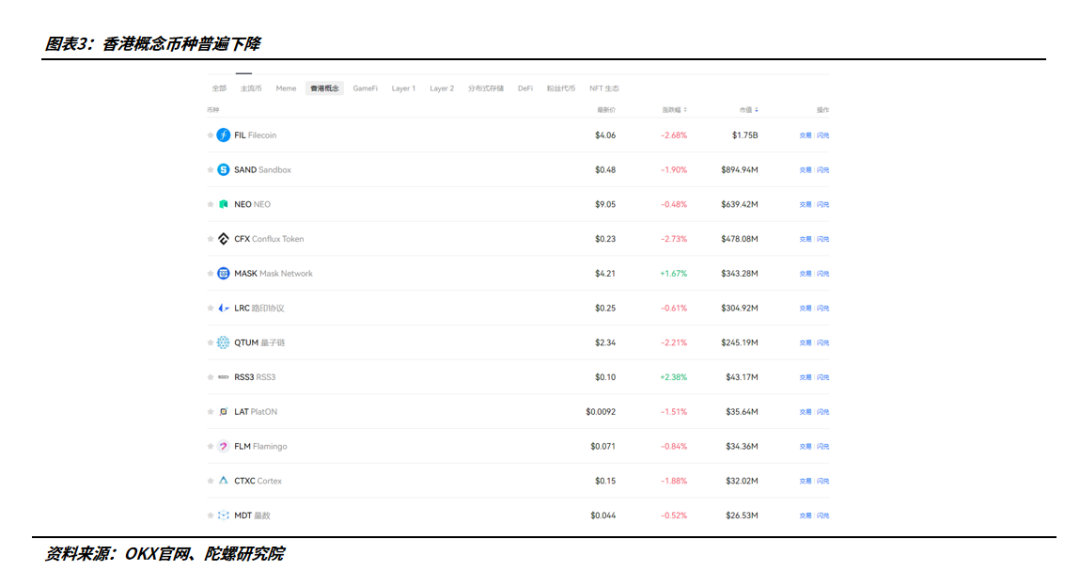 其次,本次政策对于散户的利好影响也极为有限。 一方面,零售的放开度仍有不足,预计可投资币种限制颇多,关键的DeFi领域也尚未明确,后续该领域如何被纳入散户的投资组合有待考察。另一方面,交易成本也是散户关注的一点,相比合规交易所高达3%的成本,币安、OKX等主流交易所费率基本在千分之一之内,海外交易所的低廉手续费显然更为友好。