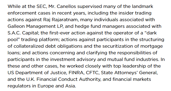 在 SEC 期间,Canellos 曾监督过许多具有里程碑意义的执法案件,其中以两起美国金融历史上关键性的内幕交易大案最为知名。