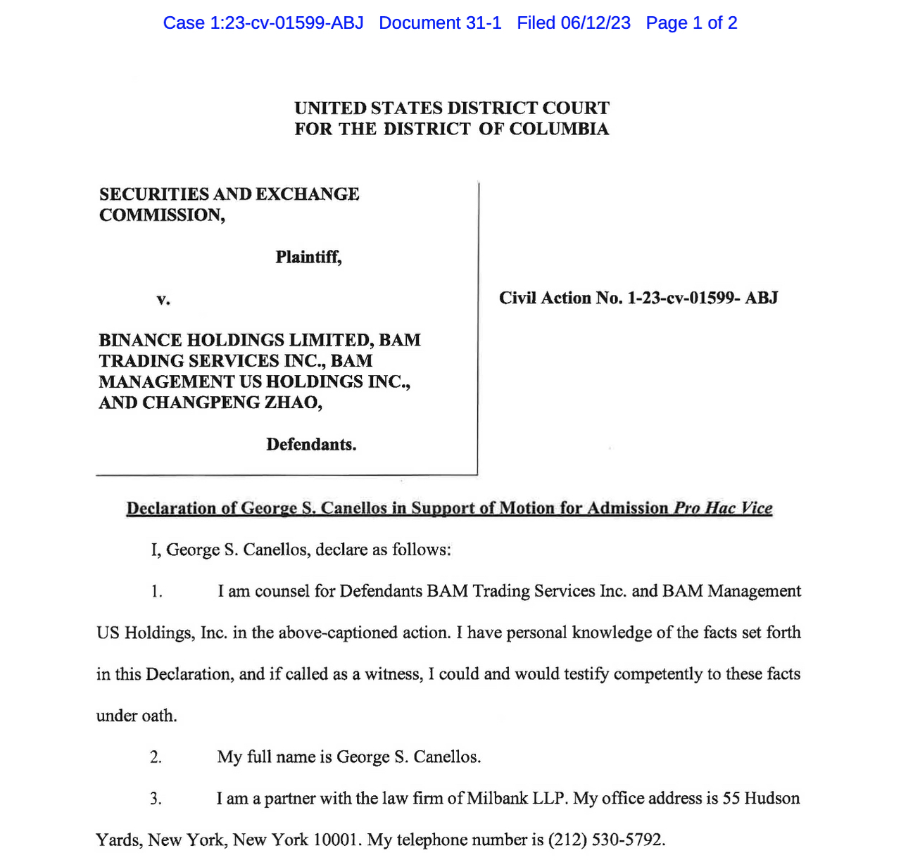6 月 12 日,法院文件显示,Binance.US 聘请了总部位于纽约的知名律所 Milbank(美国美邦律师事务所)的四名律师,其中包括 Milbank 诉讼和仲裁小组的全球负责人、纽约办事处的合伙人 George Canellos。