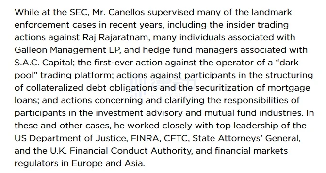在 SEC 期间,Canellos 曾监督过许多具有里程碑意义的执法案件,其中以两起美国金融历史上关键性的内幕交易大案最为知名。