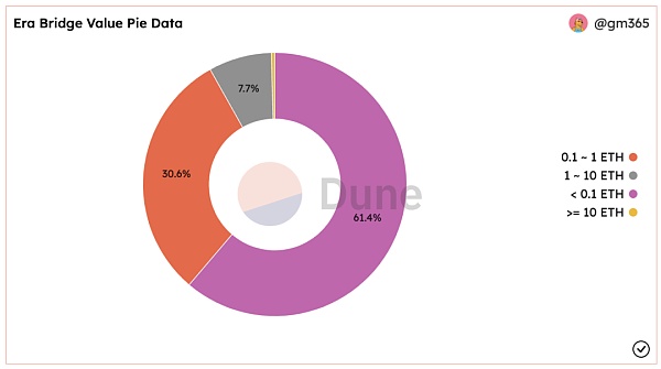 而且,目前 zkSync Era 的独立地址数虽然增长非常迅猛, 短短两个月就达到92.07万, 跨链桥上的 ETH 数也一路突破新高,超过28万个,但是从每个地址的ETH余额来看 ,超过 61.4% 的地址余额是低于 0.1ETH 的,30.6% 的地址余额在 0.1~1ETH 之间,7.7% 的地址余额在 1~10ETH 之间,剩余 0.3% 的地址余额在 10ETH 以上。