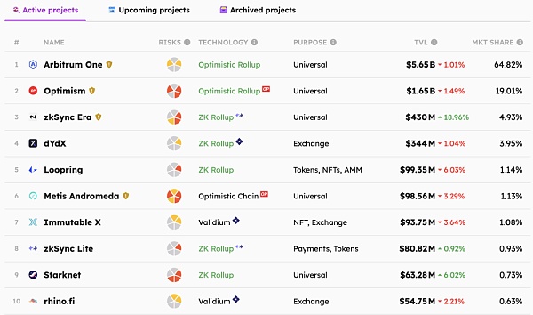Layer2 项目 TVL 排行,目前 zkSync Era 排名第三,仅次于 Optimism,数据来源:L2beat