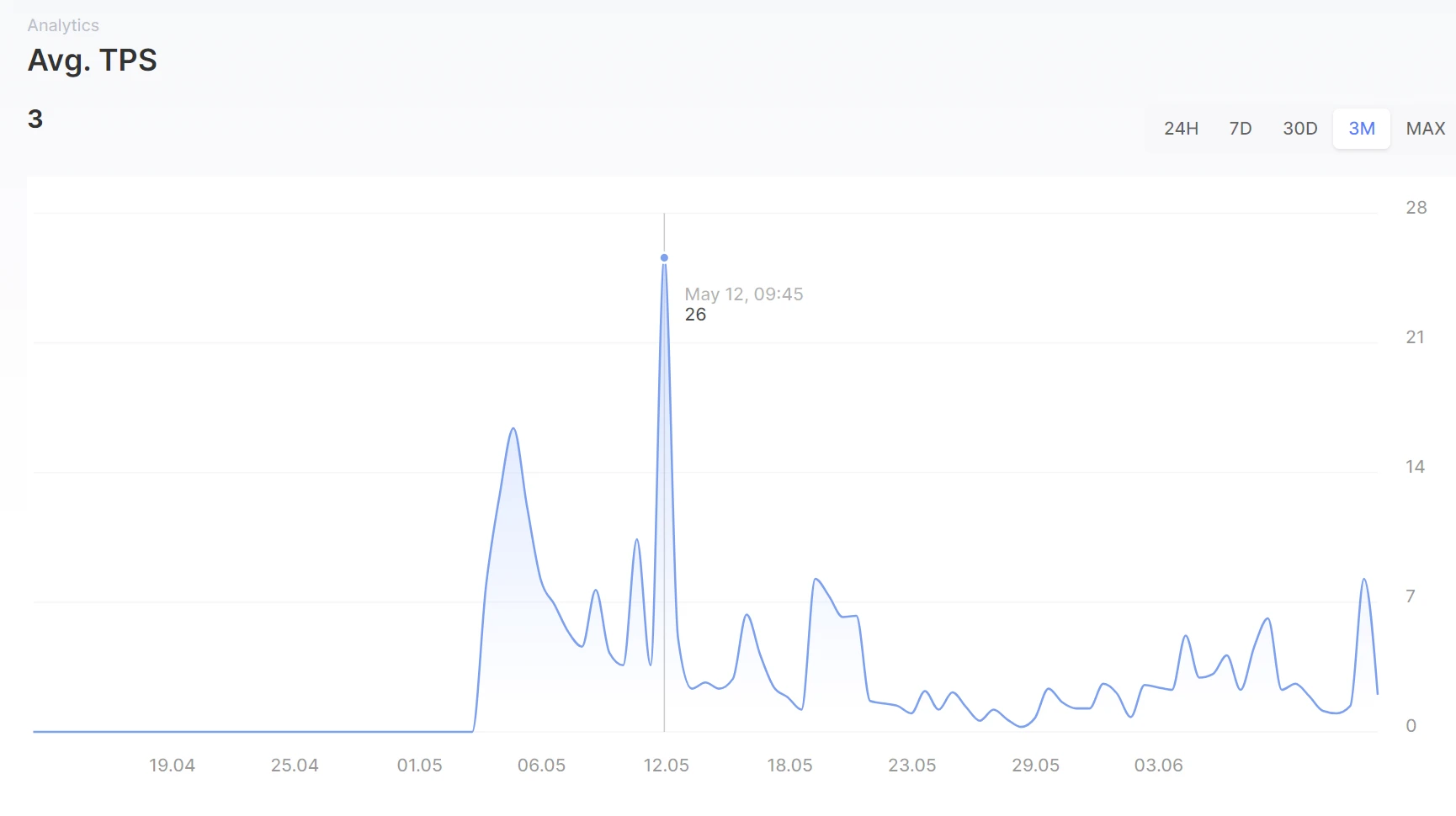 上线至今,总交易次数为 1653 万次,平均 TPS*为 3 ,总活跃地址数为 85 万个,活跃节点为 104 个。从下图可知,上线以来最高的 TPS 为 26 ,出现 5 月 12 日,是 Turbos IDO 的日期。