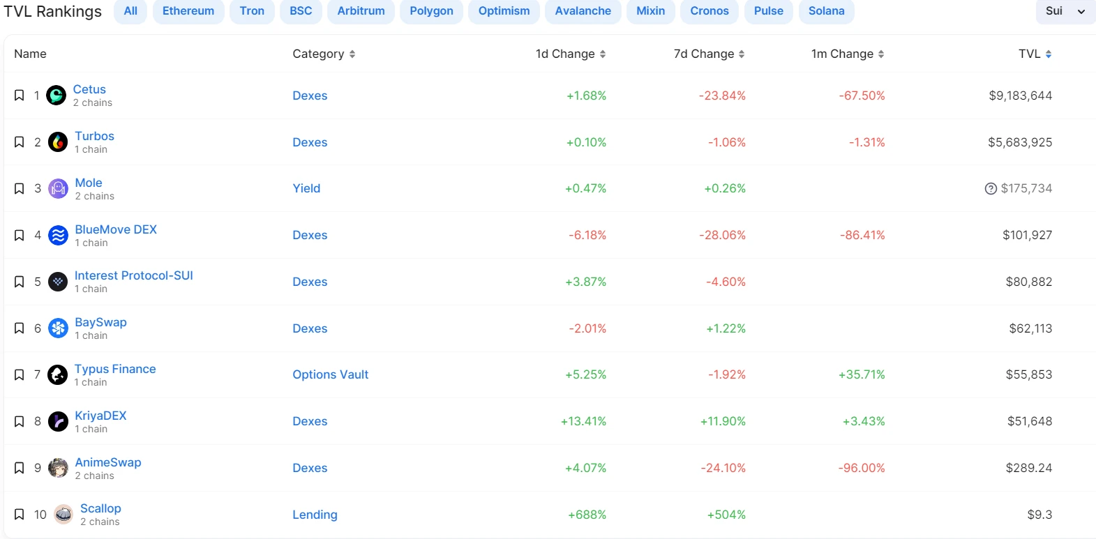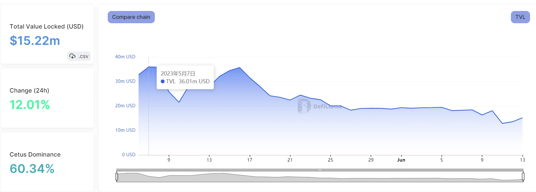 截至 6 月 13 日,Sui 的 TVL 是 1522 万美元,其中,DEX Cetus 占据了超过 60% 的 TVL。在全部公链和二层中,该 TVL 排名在第 54 名。其峰值时 TVL 达到 3601 万美元,相当于下跌了 50% 以上。