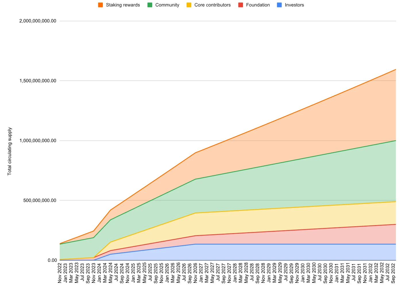 Aptos 代币总供应量(排除质押激励部分)为 10 亿枚,初始流通为 1.3 亿枚,占比 13% 。上线后第一年,每个月社区和基金会所持部分代币会解锁 454 万枚,占代币总量的 0.45% ,折合市值计算约为 2800 万美元。