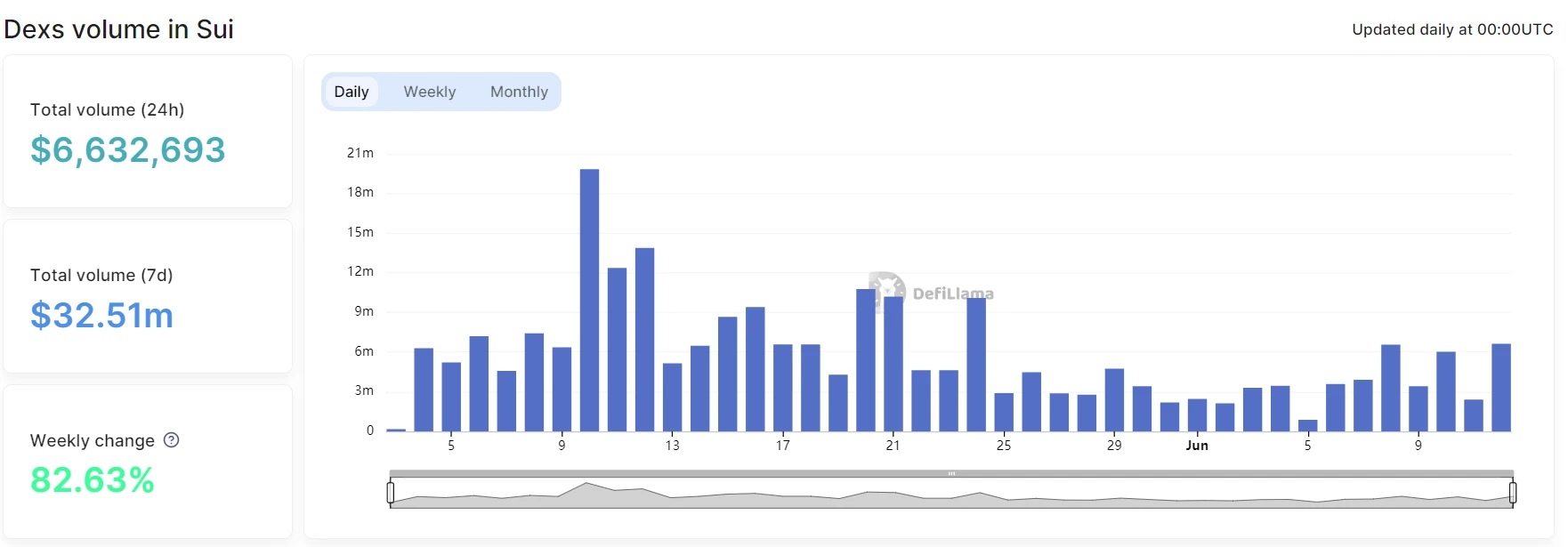 Sui 上 DEX 的日交易量最高值发生在 5 月 10 日,超过 1900 万美元,此后下跌。6 月份以来日交易量大多在 300 万至 600 万之间,交易量较低。