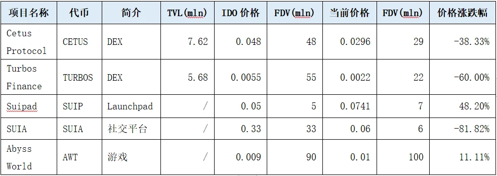可见,Sui 上的生态项目上线后大多表现不佳。作为头部 DEX 的两个项目,均已破发。社交平台 SUIA 更是下跌了将近 81.82% 。Suipad 表现相对较好,主要原因在于 IDO 时的定价比较低,FDV 仅为 500 万美元。