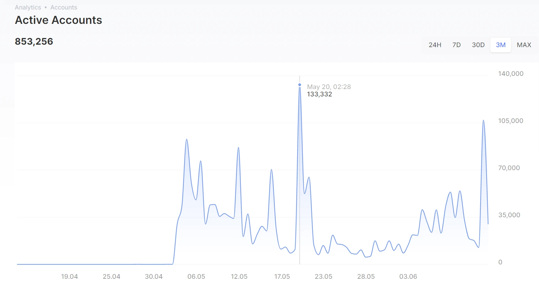 从日活跃地址看,最高日活跃地址出现在 5 月 20 日,达到 13 万个,主要原因在于 5 月 19 日 Cetus 开放无许可池功能,meme 项目进行全网空投。在平时的话,日活跃地址低于 1 万个。