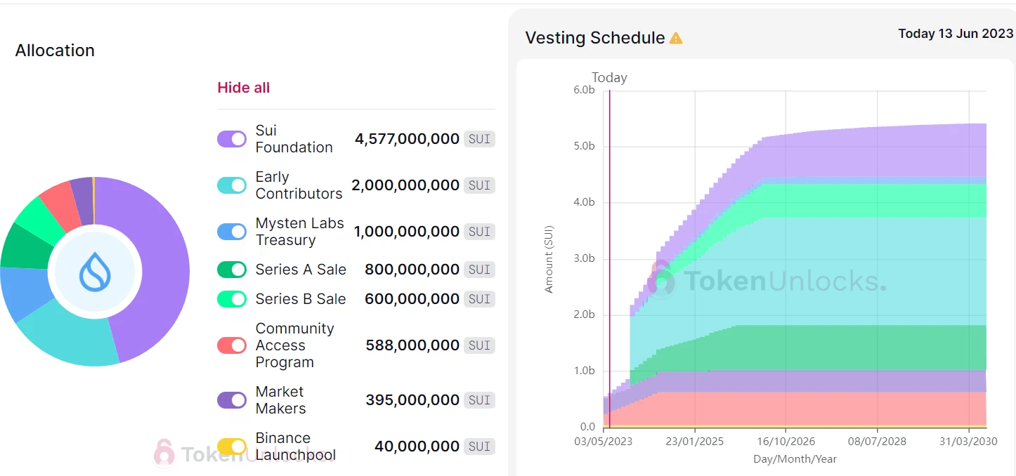 社区最为关注的是 Sui 的代币释放情况。这是来自 token.unlocks 的代币分配和解锁示意图,采用的是币安相关报告的数据。代币总量是 100 亿枚,初始流通量为 5.28 亿枚,流通占比 5.28% 。
