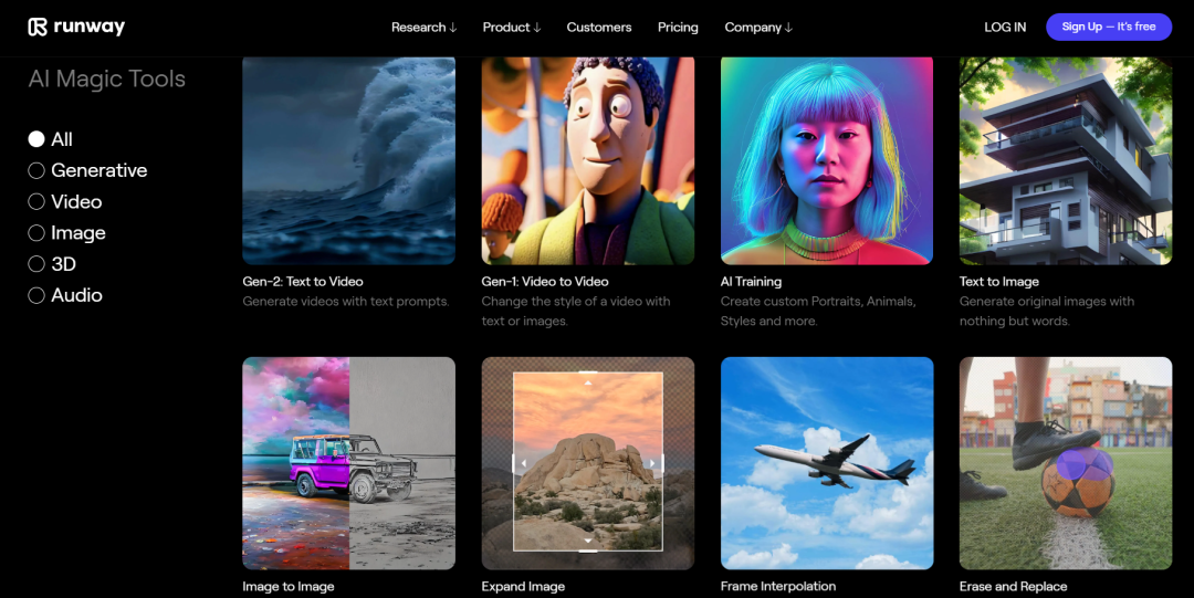 随后Runway基于新的AI算法发布大约30余个AI创作工具 ,包含音频、图片、视频、3D和生成五个大类,涵盖了几乎所有的音视频内容生成和处理工具。