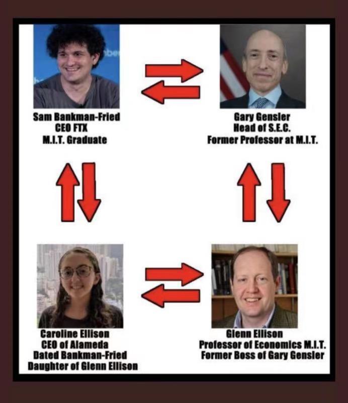 一是 对于 Gary Gensle r 个人疑似“公报私仇”的不满。 FTX 的暴雷业内除了对Gary Gensle和美SEC 监管不利的不满外,更引起公愤的恐怕是Gary Gensle和FTX 千丝万缕的联系。他在 CFTC 任职时期的旧部不少加入FTX.US 就职,更值得深究的是, Alameda CEO Caroline 也是SBF 前女朋友的父亲是麻省理工经济学教授和主任,也即 Gensler 在麻省理工教书时的前上司。而赵长鹏在 FTX 崩盘一事中曾发挥的“推波助澜”作用,Gensler 痛击币安也被许多加密用户理解为 Gensler 欲借此来“公报私仇”。