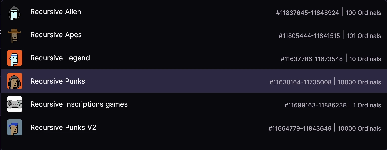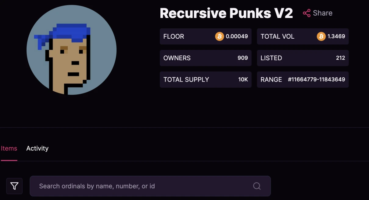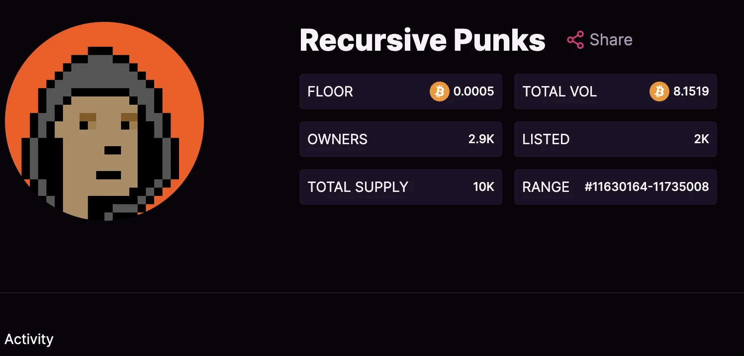 递归铭文诞生后,社区或个人基于其语法构建了多个项目,目前在交易平台 MagicEden 上已经上线合集和索引的已有 6 款。下面 PANews 将以日内交易量排名前列,且非常具有故事性和戏剧性的 Recursive Punks 系列为例做一介绍。