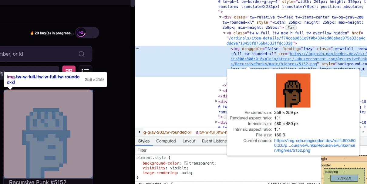 让社区惊讶的是本该是无图系列,却在 MagicEden 上显示清晰大图。经过技术人员分析,原来是 Recursive Punks 官方向 MagicEden 提交合集后,使用前端渲染的方式使得其可以在 MagicEden 平台上显示图片。也就是说其并未使用递归铭文的实现方式来展示,这一定程度上与社区预想不符。