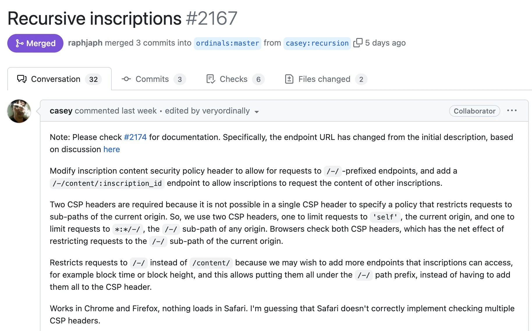 但近期由比特币协议 Ordinals 创建者 Casey Rodarmor 提出的“递归铭文”让社区为之一惊,也让社区展开了更多畅想。6 月 12 日,比特币协议 Ordinals 新任首席维护者 Raph 在 Github 上将“递归铭文” 2167 号更新合并到 Ordinals 代码中,该铭文可以使用特殊的“/-/content/:inscription_id”语法来请求其他铭文的内容。这个简单的改变解锁了许多强大的用例。
