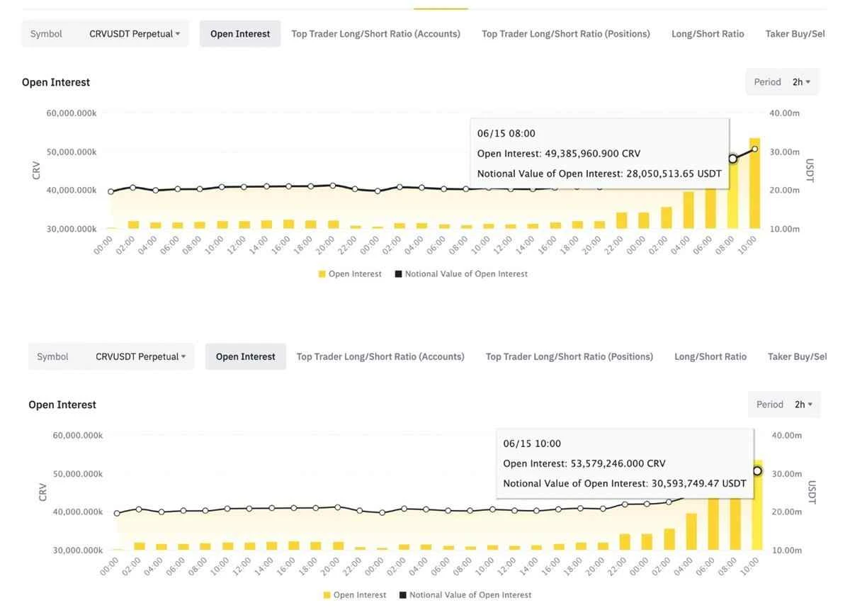 虽然链上借 CRV 的途径较少,但链上 CRV 现货抛压较大, 并且,过去 6 小时中心化交易平台的做空行为增长显著 ( 190% + APY on BN to short CRV),OI 两小时增加 500 w, 24 hr 增加 1400 w。