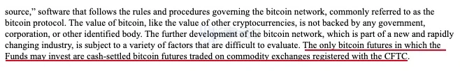 同年,贝莱德公司表示,其全球分配基金通过 CME 的比特币期货发行获得了一些比特币风险敞口。贝莱德旗下两只基金公司「贝莱德环球资产配置基金(BlackRock Global Allocation Fund)」和「BlackRock Funds V」在提交给美国证券交易委员会中的投资说明书(497 Prospectus)中表示,旗下的某些基金可参与基于比特币的期货合约交易。投资说明书还表示,并非所有的比特币期货合约都可进行投资,而是经过美国商品交易委员会(CFTC)注册以现金进行结算的比特币期货。