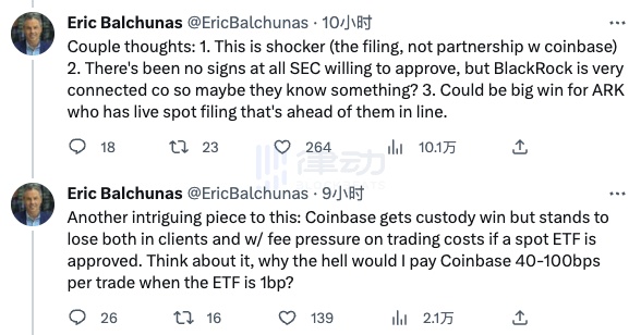 彭博社资深 ETF 分析员 Eric Balchunas(@EricBalchunas)认为,没有任何迹象表明 SEC 会批准申请,但鉴于贝莱德与他们关系密切,所以或许贝莱德是否知道些什么?另一个有趣的地方是:Coinbase 获得了托管权的胜利,但如果现货 ETF 获得批准,它将失去客户和交易成本的费用压力。想想看,当 ETF 是 1 个基点时,我为什么要向 Coinbase 支付每笔交易 40-100 个基点?