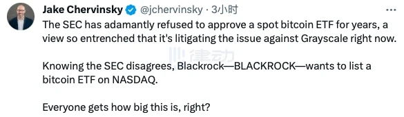 在近期 SEC 监管压力巨大,且多支现货比特币 ETF 未被批准的情况下,全球最大资管巨头的比特币 ETF 申请令人非常意外。Variant Fund 顾问、执业律师 Jake Chervinsky(@jchervinsky)在 Twitter 上写道:「SEC 多年来一直坚决拒绝批准现货比特币 ETF,这种态度已经根深蒂固。明知道 SEC 对此的消极态度,贝莱德却仍希望在纳斯达克上市比特币 ETF。我们每个人都应该知道这事儿有多重要,对吧?」
