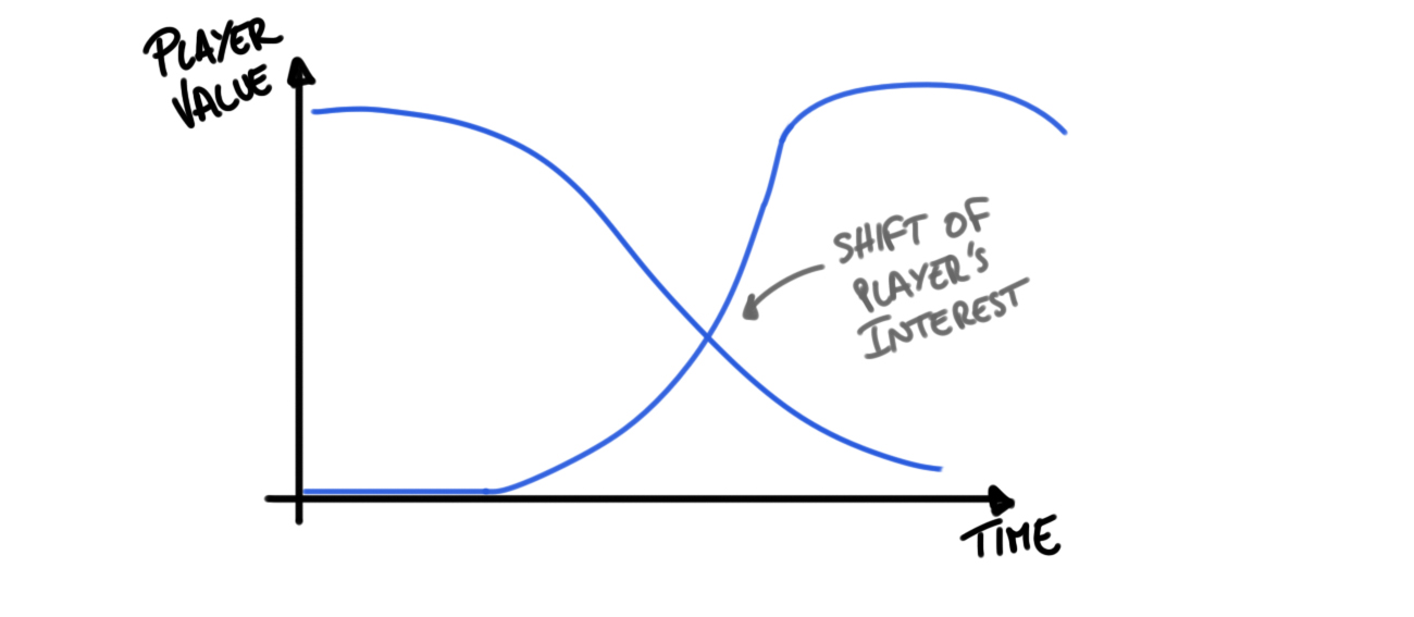 如果我们试图简单地将这些解决方案可视化,那么在玩家价值随时间变化方面,我们应该追求以下目标: